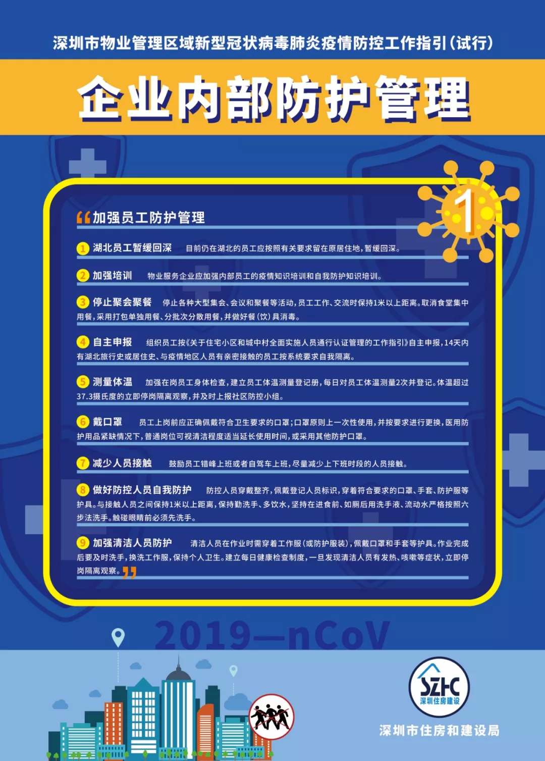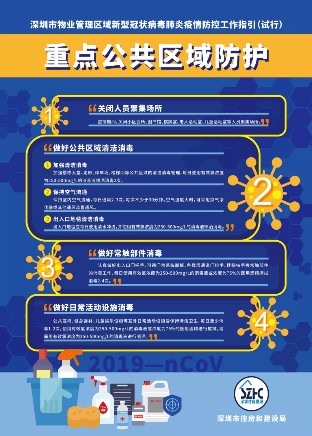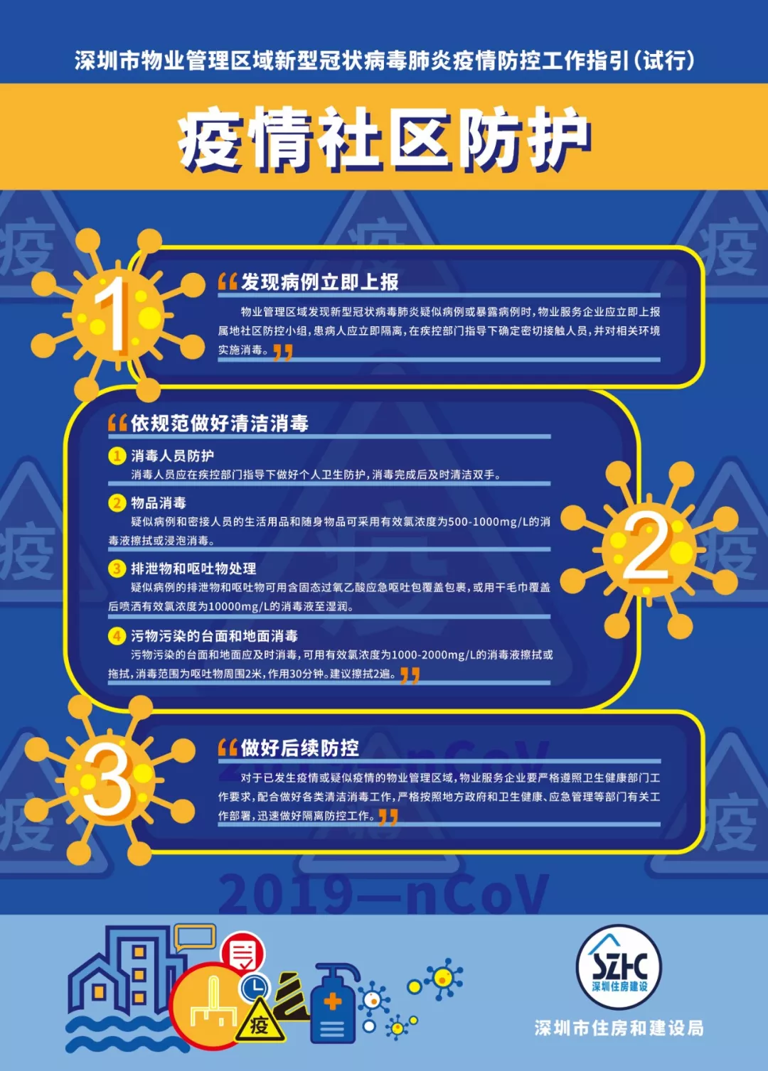 為進(jìn)一步做好物業(yè)管理區(qū)域新型冠狀病毒肺炎疫情防控工作,依據(jù)《廣東省物業(yè)管理區(qū)域新型冠狀病毒感染的肺炎疫情防控工作指引(試行)》《深圳市新型冠狀病毒感染的肺炎疫情防控指揮部印發(fā)關(guān)于建立健全社區(qū)聯(lián)防聯(lián)控機(jī)制的若干措施的通知》《深圳市新型冠狀病毒感染的肺炎疫情防控指揮部辦公室社區(qū)小區(qū)組工作方案》《深圳市新型冠狀病毒感染的肺炎疫情防控指揮部辦公室關(guān)于印發(fā)住宅小區(qū)和城中村全面實施人員通行認(rèn)證管理的工作指引的通知》等文件,結(jié)合當(dāng)前實際,市住房建設(shè)局編制了《深圳市物業(yè)管理區(qū)域新型冠狀病毒肺炎疫情防控工作指引(試行)》,現(xiàn)印發(fā)給你們,請參照執(zhí)行。