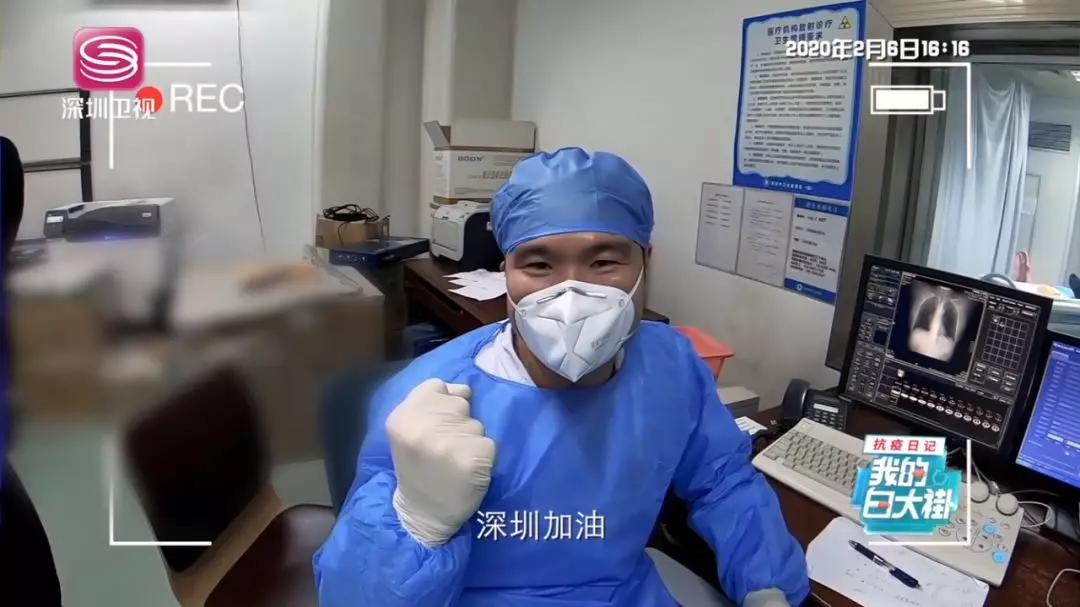 即便戴著口罩,還是能從她的語氣中聽到洋溢著的幸福感。刷過醫(yī)院醫(yī)生專有的門禁卡,袁曉珊進(jìn)入老公的辦公區(qū)域。她老公叫黃茗勇,是深圳市第三人民醫(yī)院放射科技師。見到他時(shí),1米7左右的黃茗勇身上穿著藍(lán)色醫(yī)用防護(hù)服,臉上戴著白色醫(yī)用口罩?!斑@就是我老公?!痹瑫陨阂谎劬驼J(rèn)出來了。
