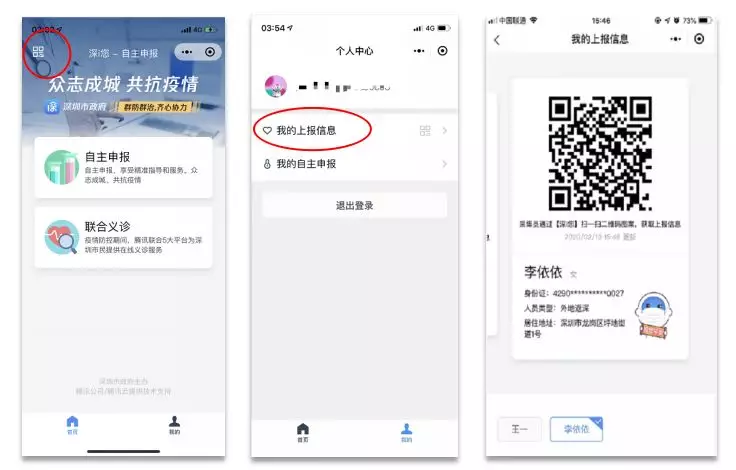 在進(jìn)出小區(qū)時(shí),可在“深i您-自主申報(bào)”小程序首頁點(diǎn)擊左上角“二維碼圖標(biāo)”或前往“我的>個(gè)人中心”點(diǎn)擊“我的上報(bào)信息”向工作人員出示“深i您-自主申報(bào)”平臺生成的系統(tǒng)認(rèn)證圖碼,憑該圖碼出入小區(qū),無需作重復(fù)申報(bào)。