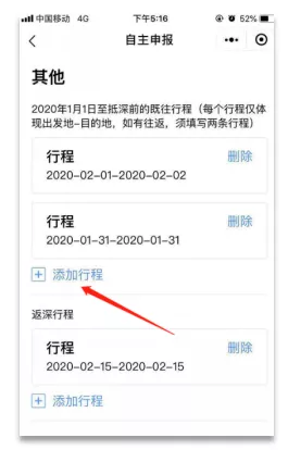 答:屬于返深人員,需要自主申報(bào)。返深人員必須填報(bào)2020年1月1日后離深的既往全部行程。如有多段行程,請?jiān)谔顖?bào)了第一條行程后,點(diǎn)擊“添加行程”或“添加下一條”按鈕,保存當(dāng)前行程并繼續(xù)添加下一條行程。您這種情況需填報(bào)3條行程記錄,分別是:深圳-黃山、黃山-東莞、東莞-深圳。