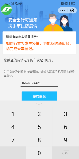 第一步:乘客使用微信掃描列車車廂內(nèi)的登記碼,登記頁面會自動顯示上次登記的手機號或在“深圳通+”小程序中注冊的手機號碼: