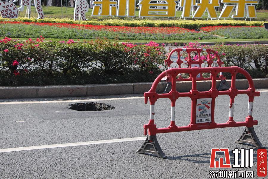 據(jù)市交通運(yùn)輸局福田管理局的蔡警官介紹,18日上午9點(diǎn)40分,他在福田區(qū)深南大道輔導(dǎo)市民廣場(chǎng)路段例行巡邏時(shí),發(fā)現(xiàn)路面有一塌陷的坑口,立即向上級(jí)匯報(bào),并用鐵馬將洞口圍起來?!按蟾攀宸昼姾螅鱾€(gè)負(fù)責(zé)部門的工作人員就陸續(xù)到場(chǎng)了,期間也沒有造成什么交通意外?!?/span>