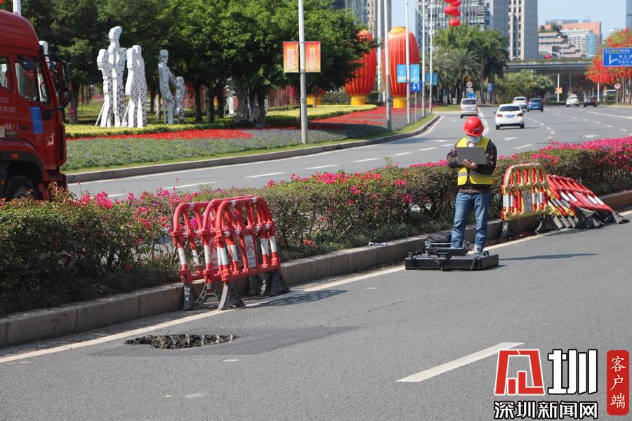 上午10點(diǎn)40分,記者在現(xiàn)場(chǎng)看到,該路面有一個(gè)直徑約一米、深約一米的坑口,旁邊還有一道長(zhǎng)約20米的裂痕。工作人員正在使用雷達(dá)儀器對(duì)地面情況進(jìn)行勘測(cè),同時(shí)該路段及靠深南大道一條車道已暫時(shí)被封鎖,福田區(qū)交警大隊(duì)也在現(xiàn)場(chǎng)指揮交通。據(jù)悉,該位置較臨近的地鐵2、3路線的站點(diǎn),一位深圳地鐵的工作人員告訴記者,目前該事故沒有對(duì)其線路運(yùn)行造成影響,也非先前修挖地鐵所致。