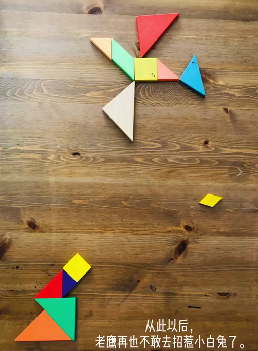 “森林里有一只可愛的小白兔,她生活在茂密的草叢中,可弱小的她在老鷹眼里就是一頓可口的大餐,一次次的逃命讓她疲憊不堪,沒有盡頭,于是小兔子決定反擊……”鼒彧媽媽告訴記者,孩子的世界是沒有限制的,她們接觸到什么就能用什么創(chuàng)建自己的奇妙世界。看似“七巧板”只是數(shù)學(xué)學(xué)具,但在鼒彧的眼里,它是小兔子、是老鷹、是大炮、是草叢…是一個(gè)美好的世界,即使老鷹想要傷害小白兔,鼒彧也只是希望能趕走它,別傷了它的性命。