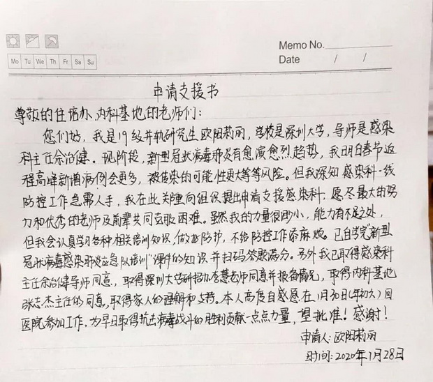 歐陽莉麗同學(xué)申請支援感染科一線的申請書