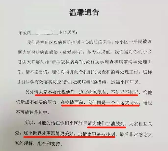 “疫情面前,我們同是一個命運共同體”“大家相互關愛,這個世界才更溫情美好,疫情更容易被控制……”1月30日,位于深圳福田區(qū)的一小區(qū)出現(xiàn)新冠肺炎疑似感染病例,福田區(qū)疾病預防控制中心的防疫醫(yī)生隨即發(fā)布了這則通告,瞬間刷屏了深圳人的朋友圈。通告除了呼吁小區(qū)居民配合調查及消毒處理工作外,還特地懇請大家“不要歧視,在疫情面前,我們是同一個命運共同體,誰也不可能獨善其身?!绷攘葦?shù)字的“請求”,感動無數(shù)人。