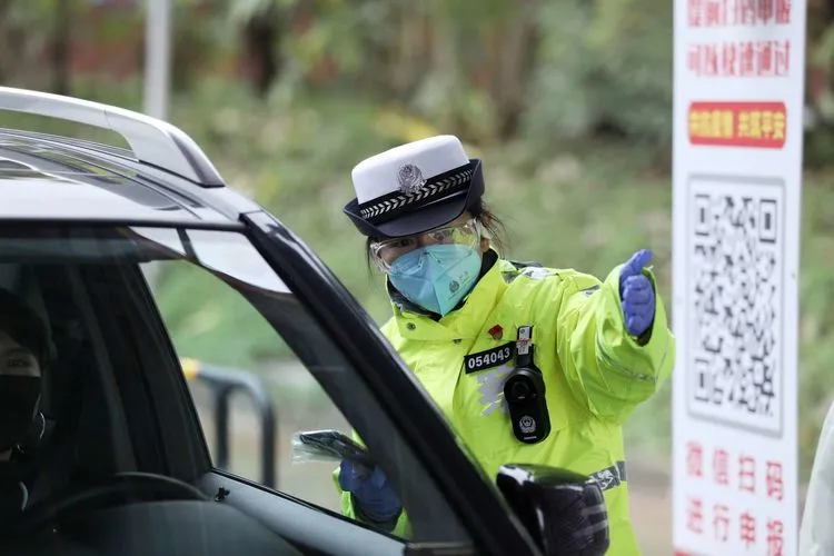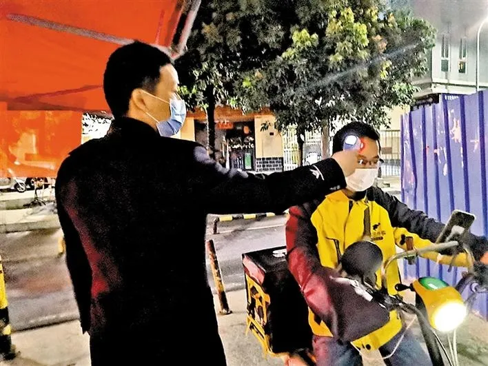 民治街道上芬社區(qū)網格員在卡點為進出人員進行體溫檢測。