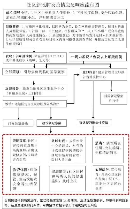 一、成立疫情應(yīng)急領(lǐng)導(dǎo)小組,建立保障機(jī)制。社區(qū)及各有關(guān)單位成立主要負(fù)責(zé)人任領(lǐng)導(dǎo)小組組長(zhǎng)的新冠肺炎疫情應(yīng)急領(lǐng)導(dǎo)小組,下設(shè)醫(yī)療保障、安全后勤保障、消毒組等職能小組,并明確職責(zé)分工。