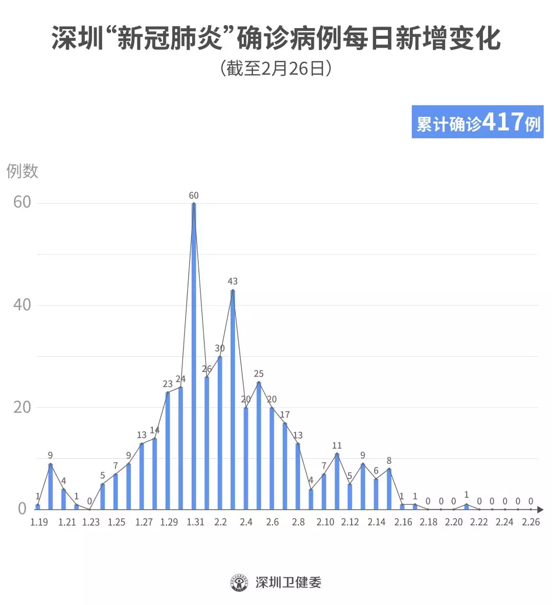 截至2月26日24時,深圳累計報告“新冠肺炎”確診病例417例。2月26日當天全市無新增確診病例,當天出院病例9例(從26日起不再公布出院個案)。
