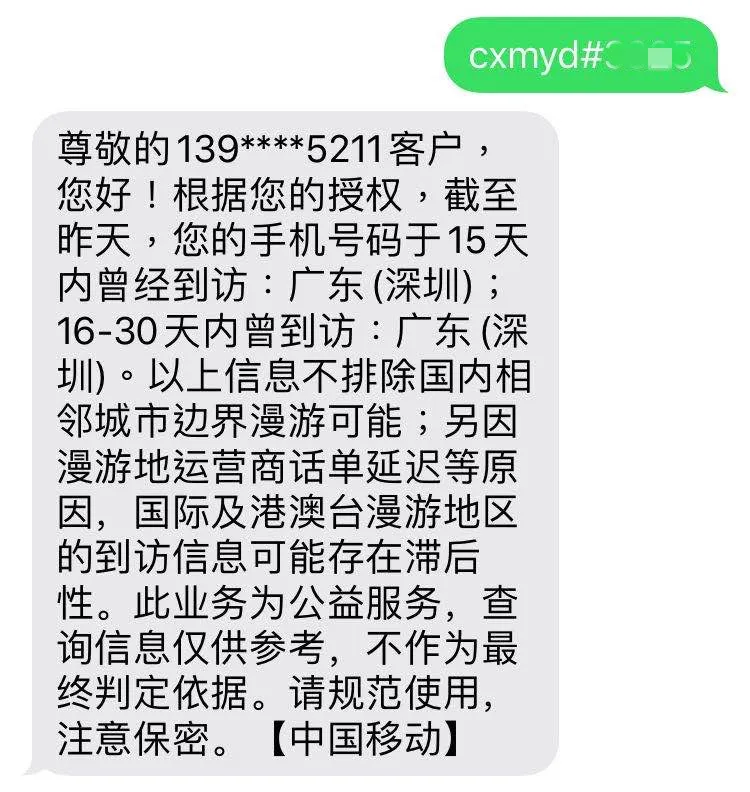 編輯短信CXMYD#身份證號碼后四位到10001,授權(quán)回復(fù)Y后,實現(xiàn)“漫游地查詢”,可查詢手機(jī)號近15日內(nèi)的途徑地信息。