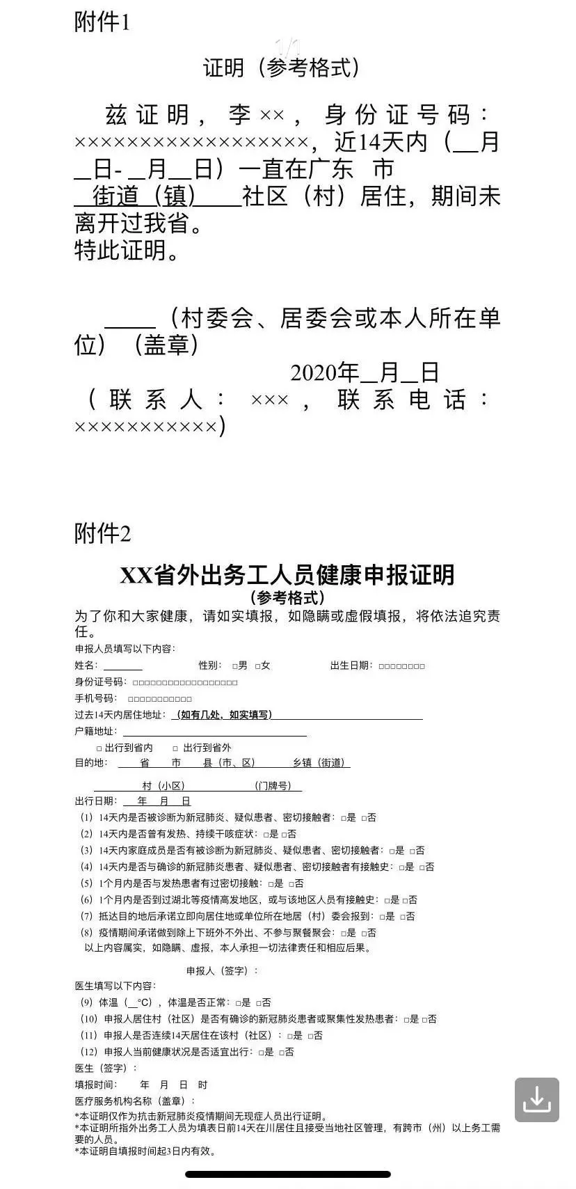 二、對持湖北省等疫情高發(fā)地區(qū)身份證來粵人員,如能提供中國移動、中國電信和中國聯(lián)通發(fā)布的個人軌跡證明信息,證明本人14天內(nèi)未離開過廣東、未到過疫情高發(fā)地的,可到社區(qū)(居委或村委)或本人所在單位申領(lǐng)證明(見附件1)。