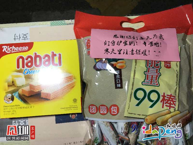 2月18日晚上,一輛奔馳車停在歐新?lián)峡c,車上下來一名女士,放下一大包零食,說了句“辛苦了”轉(zhuǎn)身就走了……零食上還貼著一張便條:“感謝你們每天為我們守護(hù)家園!辛苦啦!寒天里注意保暖!”