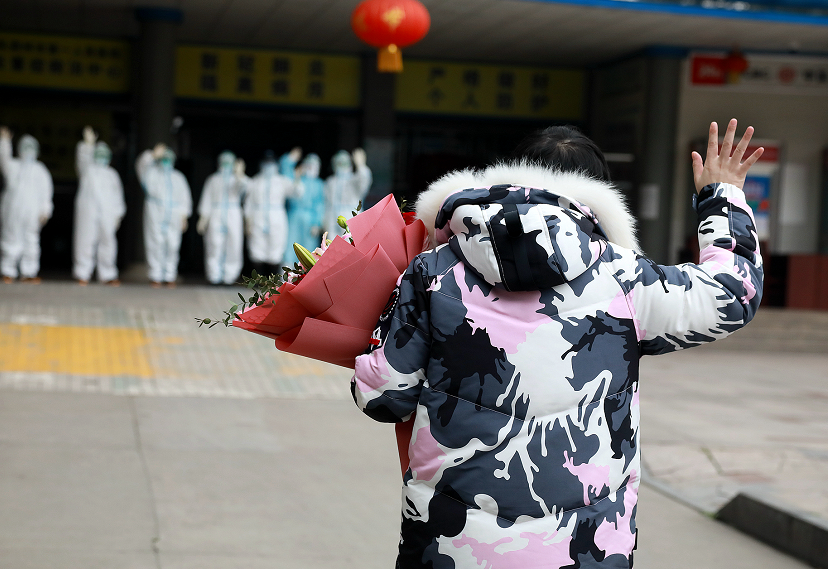 不一會(huì)兒,7名穿著防護(hù)服的醫(yī)護(hù)人員將張冬雪護(hù)送了出來。剛一露面,人群中立刻響起一陣掌聲。2位早已在大門外等候的護(hù)士激動(dòng)地上前與張冬雪擁抱,段昌奉也沖上去把飽含大家祝福和關(guān)心的鮮花獻(xiàn)給她。張冬雪笑著向人群揮手,走了幾步后,又回頭向依然站在門口目送她的7名醫(yī)護(hù)人員深深鞠了一躬,“謝謝,謝謝你們?!?/p>