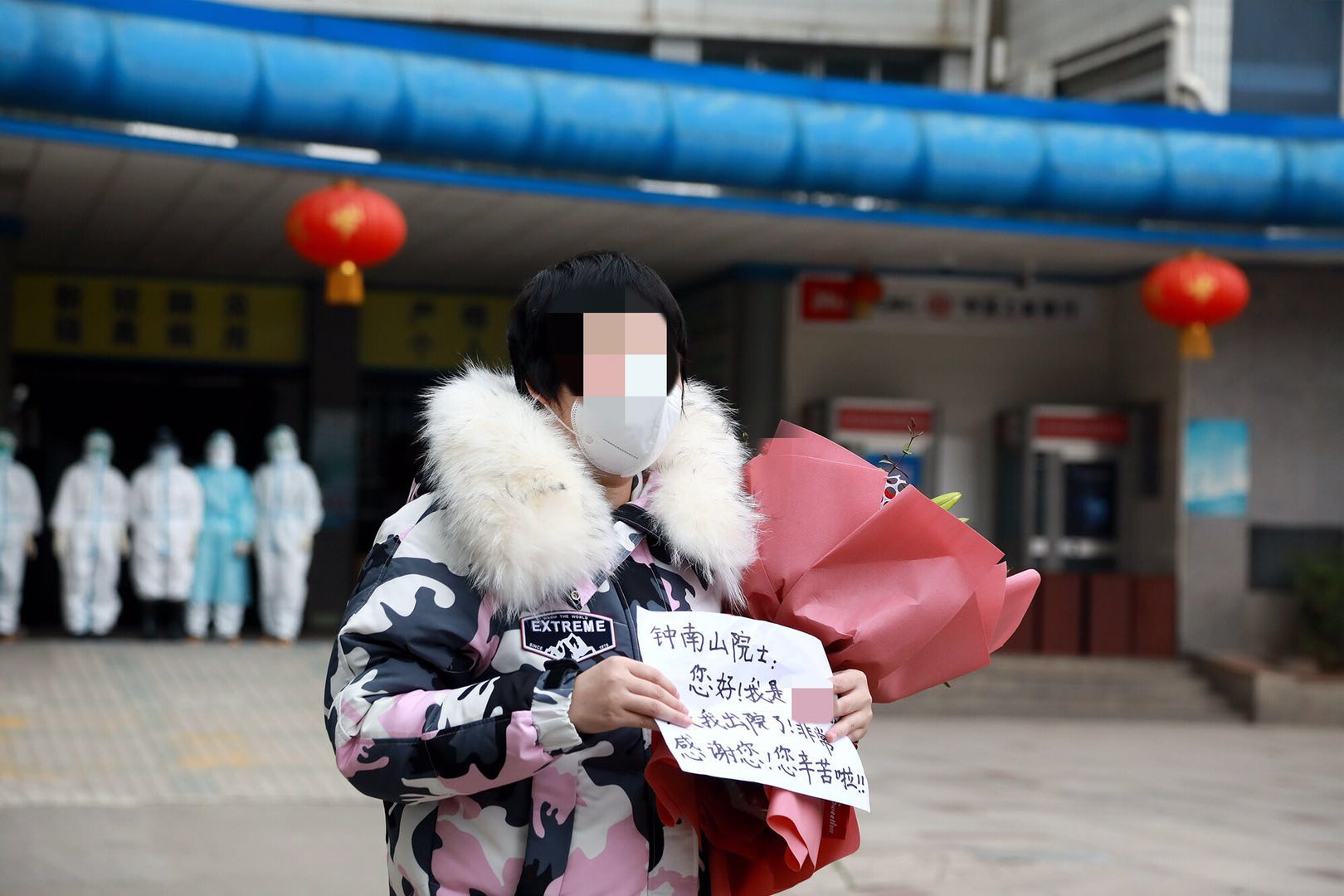 張冬雪走近后,面對(duì)記者的鏡頭,打開自己事先準(zhǔn)備好的一張紙,上面寫著“鐘南山院士,您好,今天我出院了,非常感謝您,您辛苦啦!”