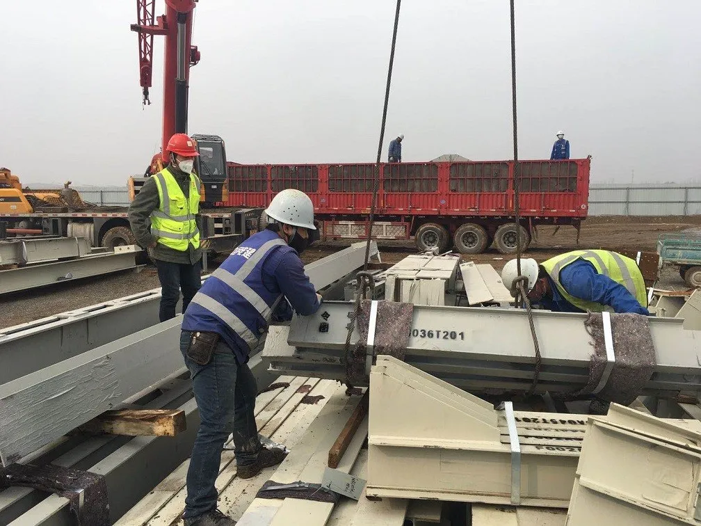任丘能源生態(tài)園復(fù)工后首車(chē)鋼結(jié)構(gòu)到現(xiàn)場(chǎng),相關(guān)人員正在有序清點(diǎn)、卸車(chē)、堆放,為下一步安裝工程夯實(shí)基礎(chǔ)。
