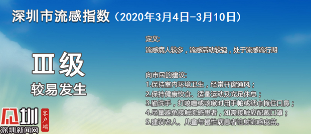 見圳客戶端·深圳新聞網(wǎng)2020年3月9日訊(見圳客戶端、深圳新聞網(wǎng)記者 劉夢(mèng)婷)根據(jù)深圳市疾控中心公布的深圳市流感指數(shù),3月份以來,深圳均顯示為Ⅲ級(jí)(較易發(fā)生),目前深圳處于流感流行期,流感活動(dòng)較強(qiáng),流感病人較多。