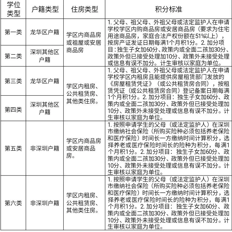 根據申請學生戶籍和住房情況,學位類型共劃分為以下6類: