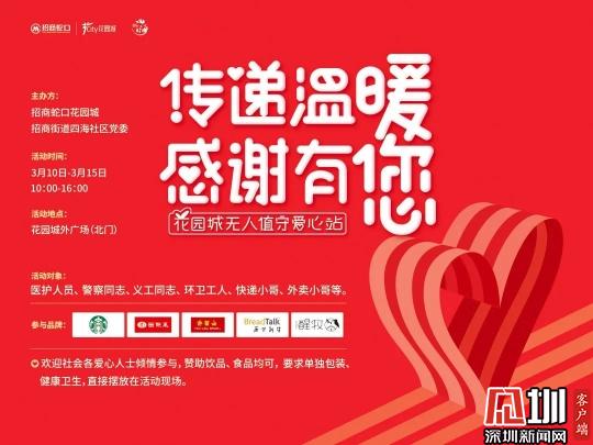 見圳客戶端·深圳新聞網訊(記者 王志明)他們奔波勞累,保障我們生活的秩序與安全他們勇敢逆行盡力守護城市的正常運轉:醫(yī)護人員、警察同志、社區(qū)工作人員、義工同志、環(huán)衛(wèi)工人、快遞小哥、外賣小哥……今天的招商街道,多了一道靚麗的風景線。 為了向這群最可愛的人表達我們的感恩、感動,招商街道四海社區(qū)黨委攜手招商蛇口花園城,共同開啟“無人值守愛心站”公益活動,每天提供上千份愛心食品免費領取,感謝在這座城市里那些不斷奔波守護著大家生活的平凡英雄們。 活動時間:3月10日至3月15日 活動地點:花園城外廣場 活動對象:醫(yī)護人員、警察同志、社區(qū)工作人員、 義工同志、環(huán)衛(wèi)工人、快遞小哥、外賣小哥等 除了星巴克、面包新語、面點王、許留山、醒牧等商家熱心公益傾情參與此次公益活動,花園城的許多員工也自發(fā)的采購起來,抱著一份份愛與尊敬時刻補貨,用自己微小的力量幫助著逆行者們。 花園城無人值守愛心站活動時間為3月10日至15日,持續(xù)6天,歡迎社會愛心人士傾情參與食品贊助,所提供物品采用單獨包裝、健康衛(wèi)生,直接擺放在活動現(xiàn)場即可。 春暖花開,山河無恙,人間皆安。待疫情結束,我們定會溫暖相遇在這座鮮花簇擁的城市里。