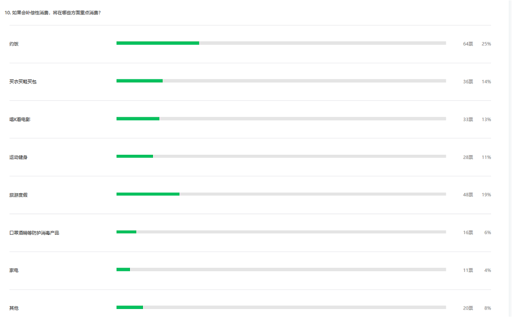 整體看,疫情對深圳市民總體消費意愿有影響。調查顯示,近四成受訪者表示疫情結束后會有補償性消費,約飯、旅游度假、買衣買鞋買包、唱K看電影以及運動健身成為疫情過后補償性消費的五大主要領域。