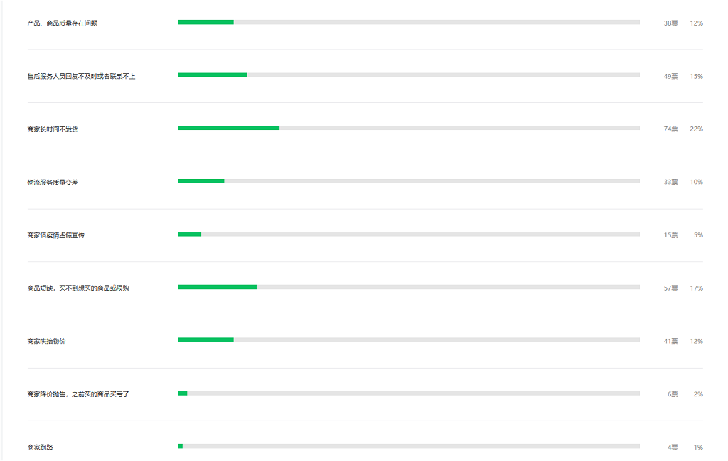 不少市民表示,疫情期間“在線消費”遇到過問題。其中,長時間不發(fā)貨、因商品短缺或限購買不到商品、售后服務人員回復不及時或聯(lián)系不上位列市民消費不滿意榜前三;而商品質量存在問題、商家哄抬物價則并列消費不滿意榜第四。