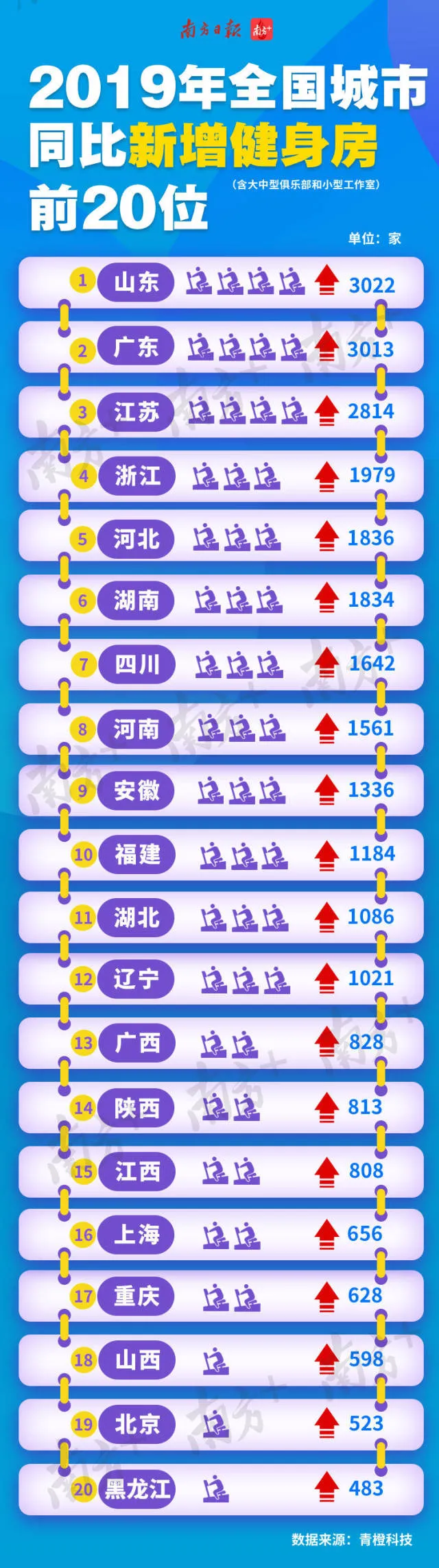 2019年同比增長了3013間健身房。增長數(shù)量位居全國第二,同期僅關(guān)閉127家健身房。