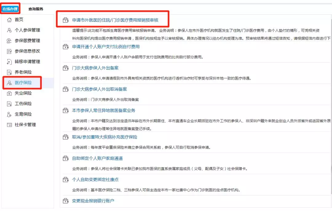 點(diǎn)擊“在線辦理”,按照指引選擇“醫(yī)療保險(xiǎn)”;點(diǎn)擊“申請(qǐng)市外就醫(yī)的住院/門診費(fèi)用報(bào)銷預(yù)審核”;