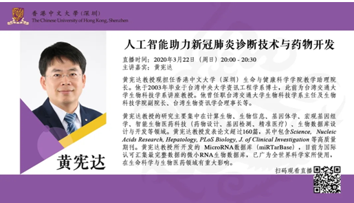 黃憲達(dá)教授現(xiàn)擔(dān)任香港中文大學(xué)(深圳)生命與健康科學(xué)學(xué)院教學(xué)助理院長、瓦謝爾計算生物研究院執(zhí)行院長。他于2003年畢業(yè)于臺灣中央大學(xué)資訊工程學(xué)系博士,此前為臺灣交通大學(xué)生物科技學(xué)系講座教授。他曾任職臺灣交通大學(xué)生物科技學(xué)系主任及生物科技學(xué)院副院長、臺灣生物資訊學(xué)會理事長等。