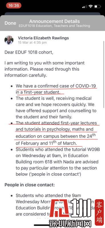 澳大利亞悉尼大學(xué)出現(xiàn)確診患者,圖為校方郵件,紅線處是確診學(xué)生的情況以及參加過(guò)的校內(nèi)活動(dòng)軌跡。