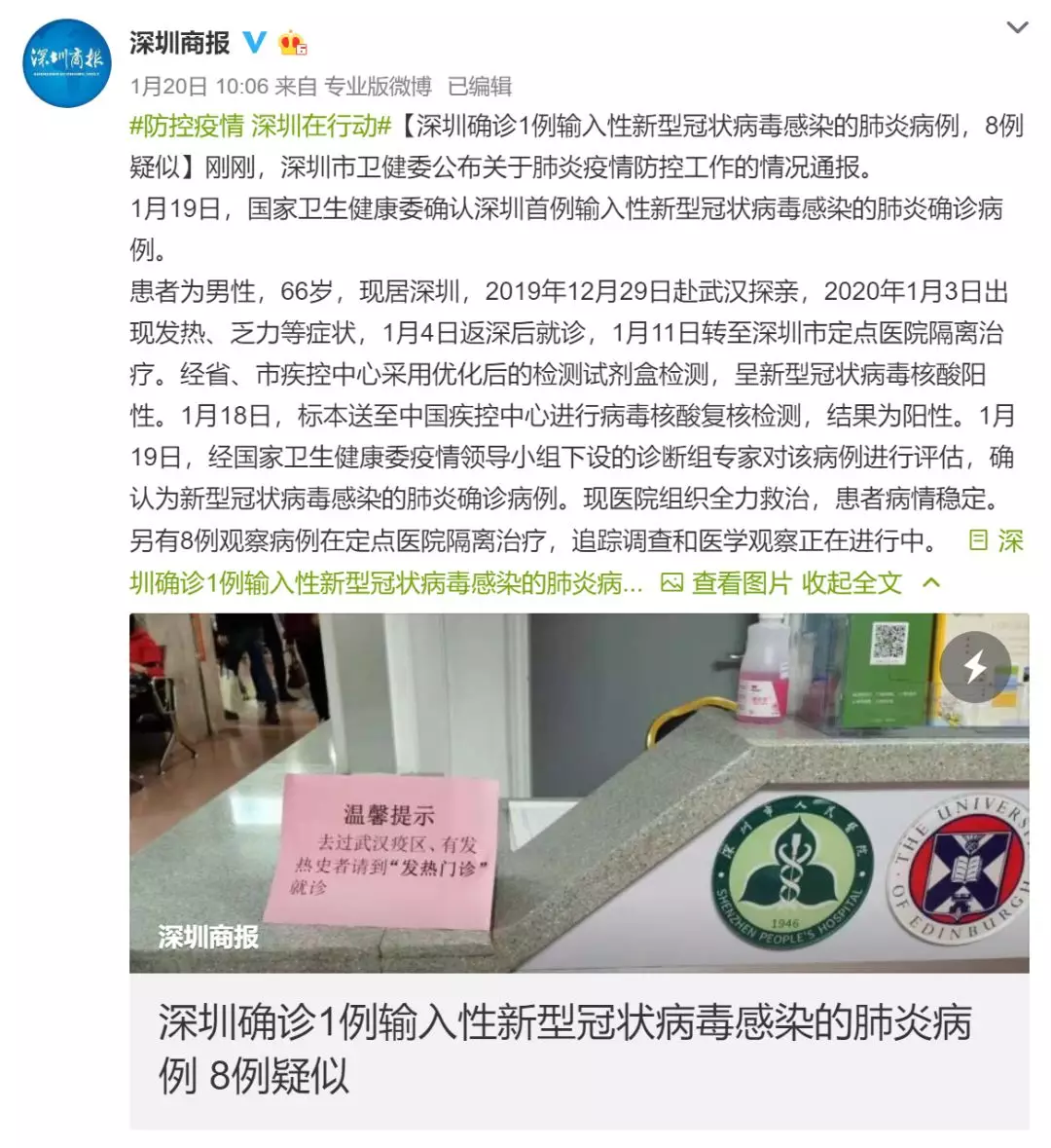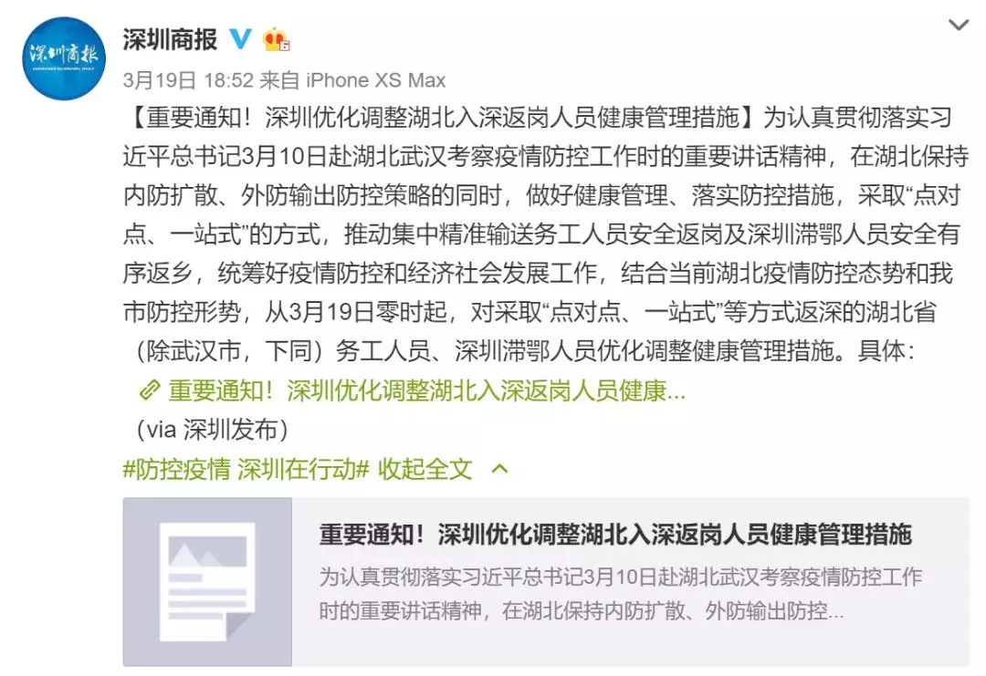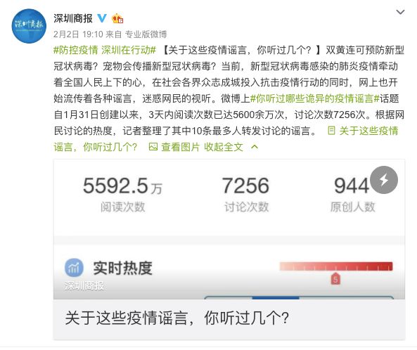 疫情發(fā)生初期,深圳商報(bào)微博創(chuàng)建話題 #防控疫情 深圳在行動# ,以高度的責(zé)任感和使命感全方位加強(qiáng)宣傳報(bào)道和輿論引導(dǎo),疫情相關(guān)信息均帶話題發(fā)布,人們可以系統(tǒng)地查看疫情相關(guān)信息。