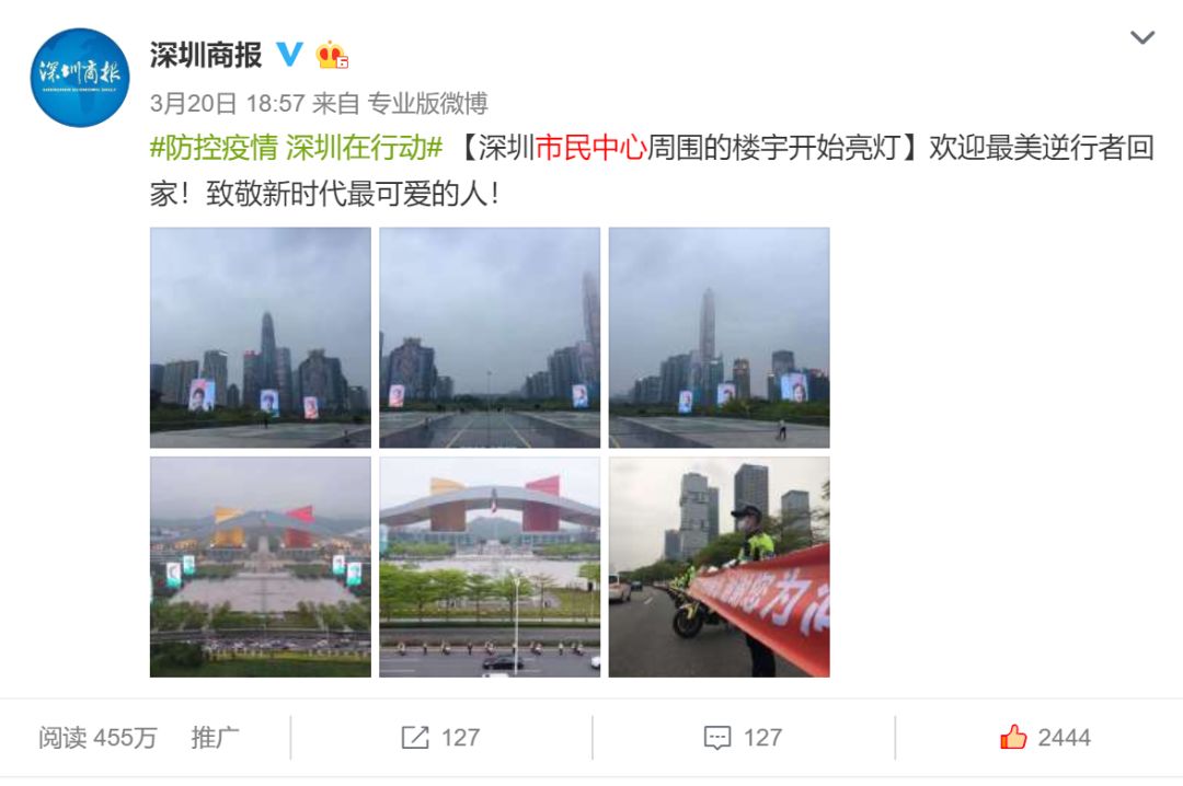 單條微博【深圳市民中心周圍的樓宇開始亮燈】閱讀數(shù)455萬+,引起了廣泛關(guān)注。