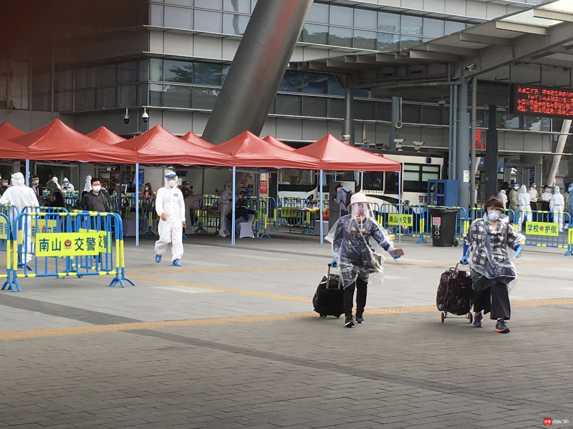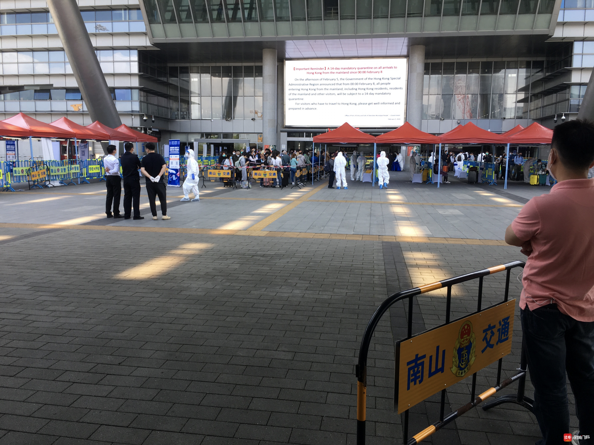 “排隊排了好幾個小時,終于出來了!”頭戴帽子、護目鏡和口罩,外加一襲透明“雨衣”的趙女士把自己包裹得嚴嚴實實,走到深圳灣口岸北廣場外才把帽子摘了,額頭微微出汗。她告訴記者,上午10點鐘她從香港出境,直到下午2點才通關。香港居民鐘先生是一名大學生,因老家有事才入境,他比趙女士要幸運一些,從11點開始通關的他花了2個多小時。
