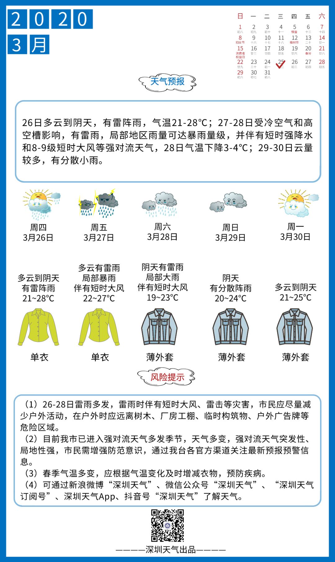26-28日,深圳雷雨頻繁;26日天氣漸趨不穩(wěn)定,有雷陣雨;27-28日受高空槽、切變線南壓影響,雷雨頻密,局部地區(qū)可達(dá)暴雨,伴短時(shí)強(qiáng)降水、8-9級(jí)短時(shí)大風(fēng)和強(qiáng)雷暴等強(qiáng)對(duì)流天氣;28日降水趨于減弱。