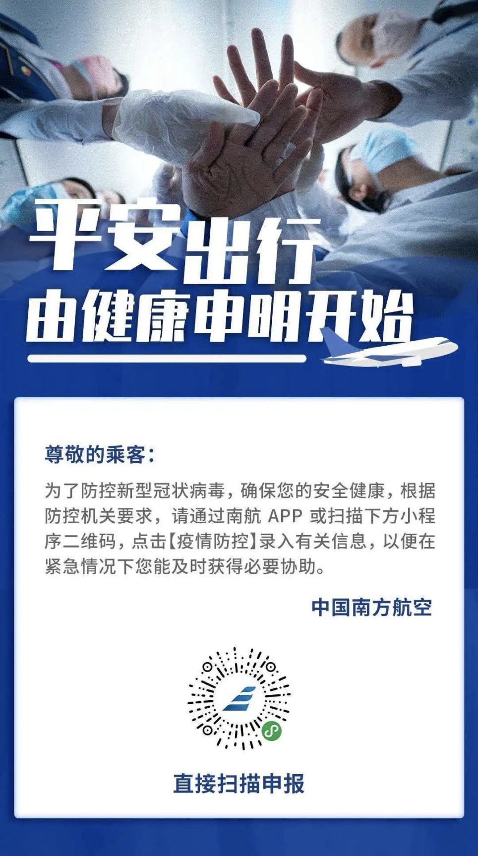 目前南航啟用“旅客健康申明”線上填寫,方便快捷,請自覺申報支持乘機疫情防控工作。