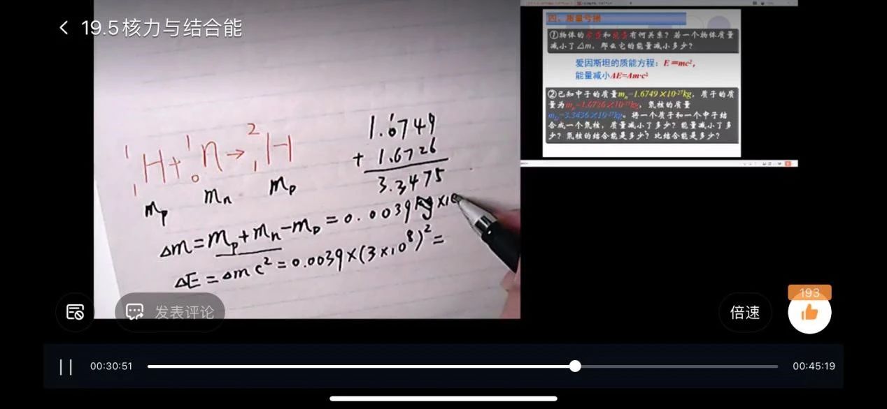 物理科何揚峰老師在執(zhí)教《核力與結(jié)合能》一課時靈活運用手寫板、電腦和手機等多種工具,讓學(xué)生能夠同時看到PPT和教師板書畫面,完美地還原了在校學(xué)習情境。