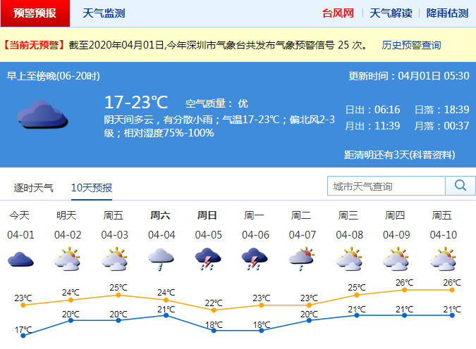 預計今日小雨轉陰天間多云,早晚有輕霧或霧,氣溫17℃-23℃;2-3日多云到陰天,間中有分散陣雨,西部有輕霧,東部沿海陣風6-7級;清明假期有明顯降雨,間中可能伴有雷暴。