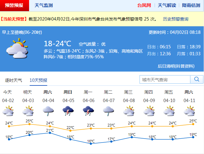 見(jiàn)圳客戶(hù)端·深圳新聞網(wǎng)2020年4月2日訊 深圳市氣象局預(yù)計(jì)2日陰天間多云,有分散陣雨,沿海和高地偏東陣風(fēng)6-7級(jí),氣溫18-22℃;3日多云間陰天,有輕霧和分散陣雨,氣溫略升;展望清明假期(4-6日)有一次明顯降雨過(guò)程,間中伴有雷暴。7日降雨結(jié)束。