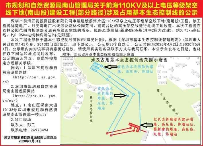 該工程將對(duì)媽灣電廠、月亮灣電廠出線,涉及荔林公園范圍、前海片區(qū)的高壓架空線,進(jìn)行電纜下地改造,荔林公園內(nèi)部分原有的高壓架空線的塔基、線路及終端站將會(huì)被拆除,將新建、改建各2座塔基。