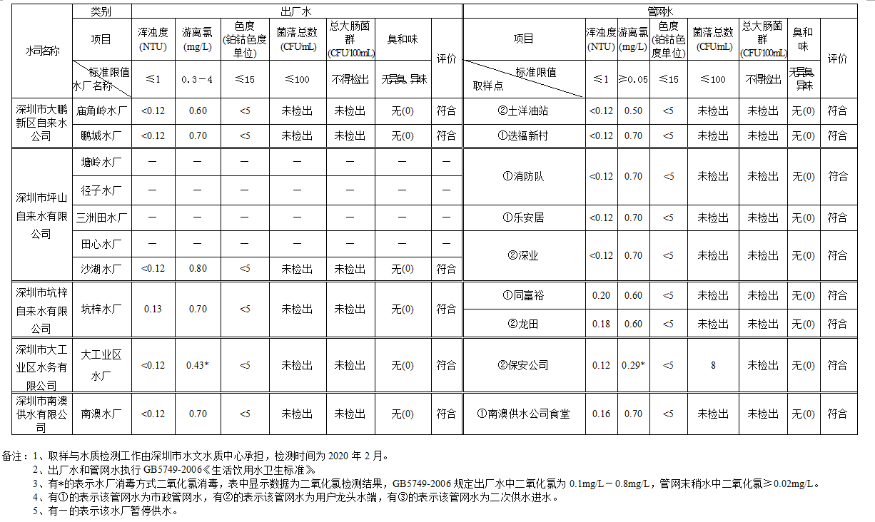 見圳客戶端·深圳新聞網(wǎng)2020年4月4日訊(見圳客戶端、深圳新聞網(wǎng)記者葉梅)2020年2月,深圳市水務(wù)局對全市42個水廠出廠水水樣以及68個管網(wǎng)水水樣進(jìn)行了抽檢。檢測結(jié)果表明,依據(jù)GB5749—2006《生活飲用水衛(wèi)生標(biāo)準(zhǔn)》,所有受檢42個出廠水水樣和68個管網(wǎng)水水樣的渾濁度、消毒劑(游離氯或二氧化氯或總氯)、色度、菌落總數(shù)、總大腸菌群及臭和味共6項常規(guī)指標(biāo)全部符合該標(biāo)準(zhǔn)的規(guī)定,出廠水水樣合格率為100%,管網(wǎng)水合格率為100%。