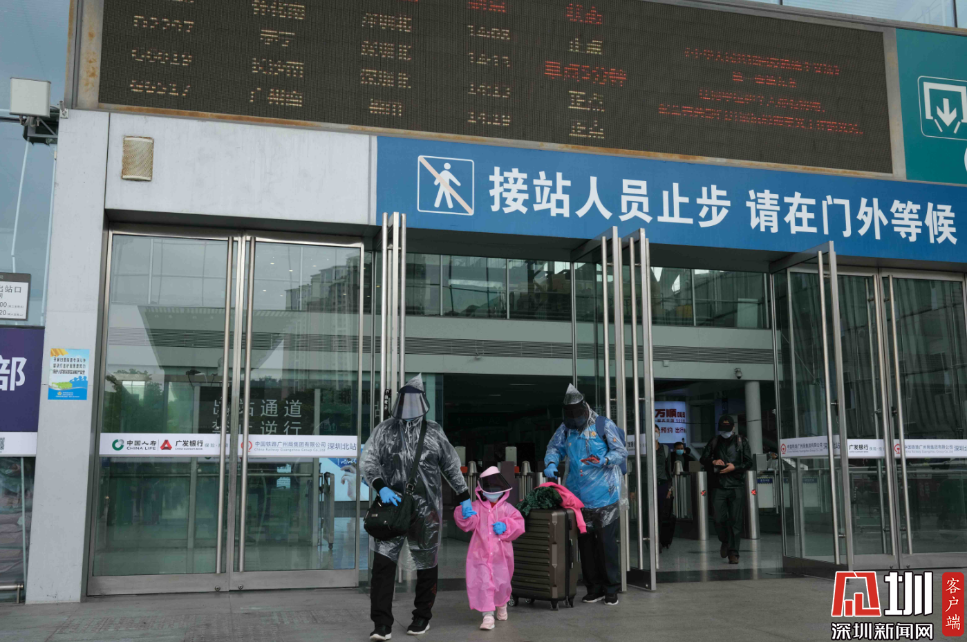 深圳北站西廣場出站口,三位“全副武裝”的旅客。