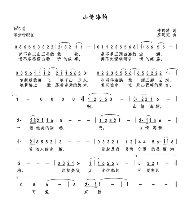 《山情海韻》歌詞大氣,飽含深情。作者以詩一般的語言為我們描繪了一幅幅優(yōu)美多姿的畫面,詮釋了深圳從一個小漁村發(fā)展成繁華大都市的壯闊景象,展現(xiàn)了年輕一代充滿活力、努力奮斗、只爭朝夕的精神面貌,催人奮進(jìn)。