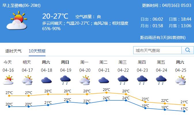 見圳客戶端·深圳新聞網2020年4月16日訊 我市今天到明天多云間晴天,16日早晚有輕霧,氣溫20-27℃;南風2級;相對濕度65%-90%。早晚稍涼,午間體感較熱,注意及時增減衣物;出門要注意防曬,戶外活動需注意及時補充水分。