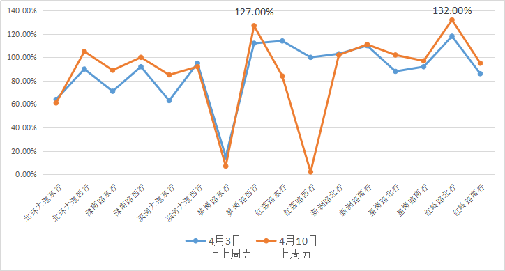 同時,主干道的飽和程度也處于高位。經(jīng)對上周五和上上周五晚高峰各主干道飽和度情況分析,筍崗路西行和紅嶺路北行飽和度最高,超過120%。預(yù)計(jì)本周五各主干道飽和度,依然維持較高狀態(tài)。