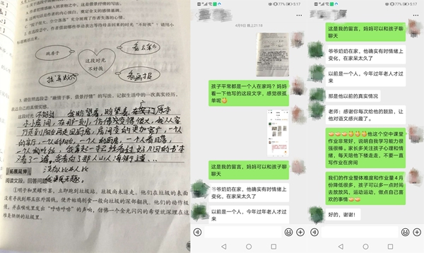 疫情來的迅猛又猝不及防,老師們一方面要完成教學(xué)任務(wù)、引導(dǎo)學(xué)生做好防疫,一方面要時(shí)刻關(guān)注學(xué)生的心理健康。學(xué)生們被迫在家度過了一個(gè)史上最長的寒假,對(duì)于處在叛逆期的孩子們來說,難免會(huì)與家人出現(xiàn)一些矛盾,在課堂之外,老師們還需要擔(dān)任“心理調(diào)節(jié)師”的角色。一次,周老師班上有個(gè)同學(xué)因?yàn)樯暇W(wǎng)課的事情與父母鬧了矛盾,一氣之下跑到奶奶家,周老師得知了這件事情,第一時(shí)間聯(lián)系上學(xué)生,通過鼓勵(lì)、引導(dǎo),讓學(xué)生認(rèn)識(shí)到自己的錯(cuò)誤,與父母和解。還有一次,周老師通過批改作業(yè),發(fā)現(xiàn)一名學(xué)生在作業(yè)中吐露了自己孤獨(dú)、無趣的心聲??吹胶?,周老師立刻與家長溝通了解情況,并建議家長多多陪伴孩子。盡管老師和學(xué)生們不能在學(xué)校的課堂上相聚,但在通訊十分發(fā)達(dá)的現(xiàn)在,老師們也始終用自己的方式陪伴在學(xué)生左右。