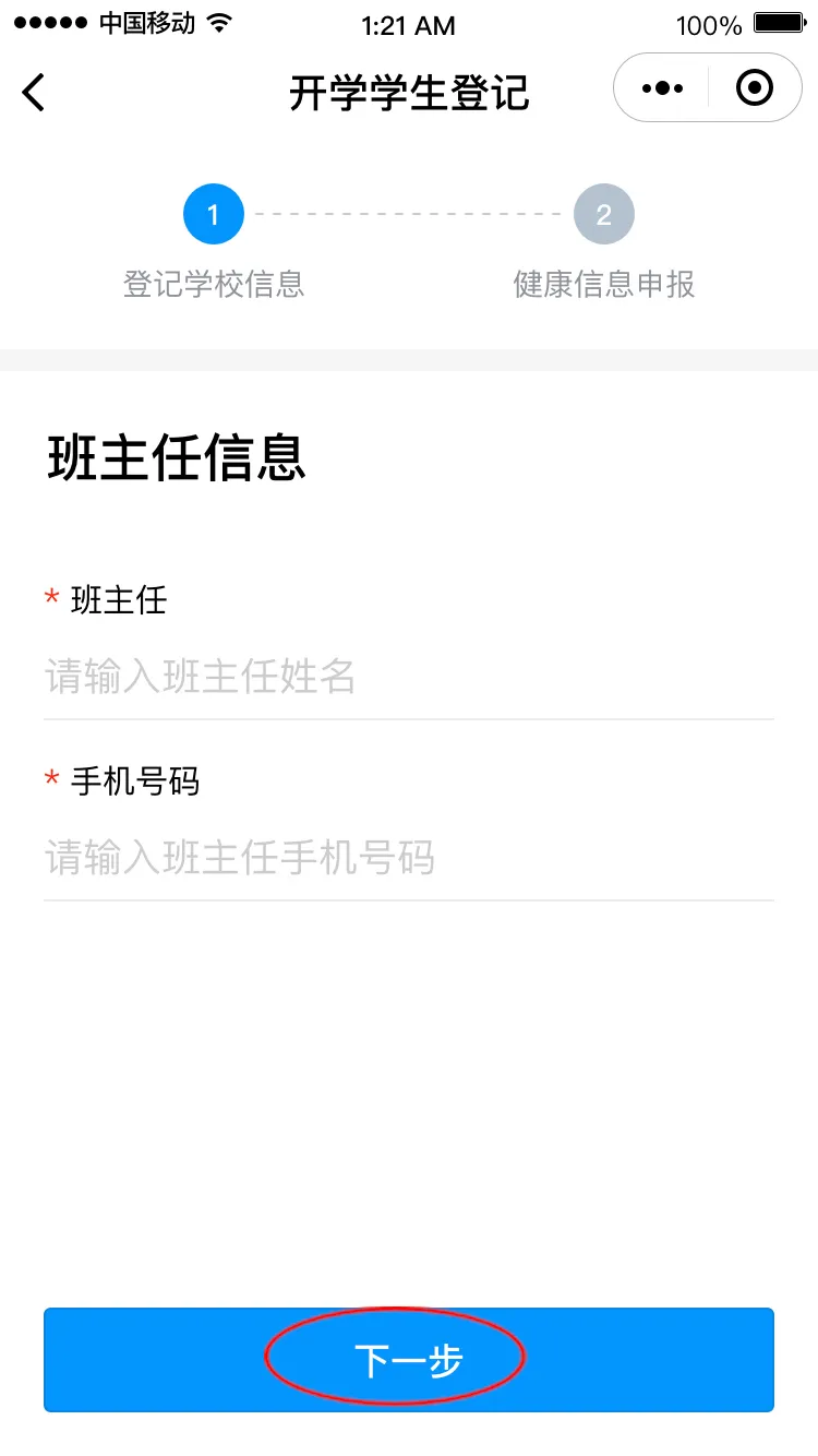 進(jìn)入“開學(xué)學(xué)生登記”頁面,點擊“馬上登記”進(jìn)入登記界面,填寫班主任姓名和手機號碼后點擊“下一步”,請選擇對應(yīng)的班級,進(jìn)入健康申報卡界面。