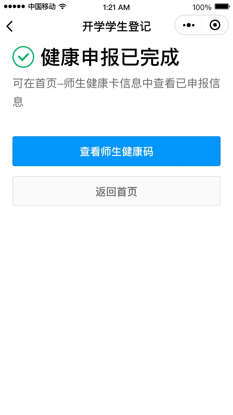 健康信息申報(bào)后,請勾選申報(bào)承諾,點(diǎn)擊“生成師生健康碼”即可完成健康申報(bào)。