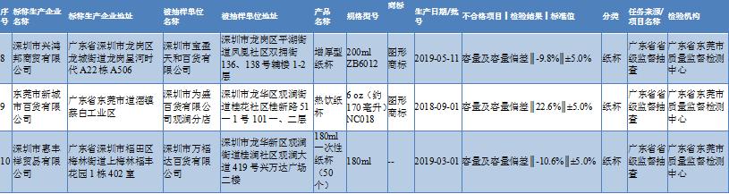 通告顯示,深圳抽檢的3批不合格樣品分別為深圳市寶盈天和百貨有限公司銷售的增厚型紙杯、為盛百貨有限公司觀瀾分店銷售的熱飲紙杯和萬福達(dá)百貨有限公司銷售的180ml一次性紙杯(50個),不合格項目均為容量及容量偏差不符合食品相關(guān)產(chǎn)品安全國家標(biāo)準(zhǔn)規(guī)定。