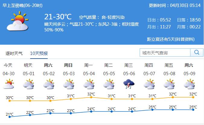 見圳客戶端·深圳新聞網(wǎng)2020年4月30日訊 我市今天晴天間多云,氣溫21-30℃;東風(fēng)2-3級,相對濕度50%-90%。五一假期期間(5月1-5日)天氣總體平穩(wěn),以多云為主,早晚有輕霧,其中5日前后偶有短時陣雨;假期期間最高氣溫可達31-32℃,中午前后天氣炎熱。森林火險氣象等級較高,要注意用火安全;注意防暑防嗮。