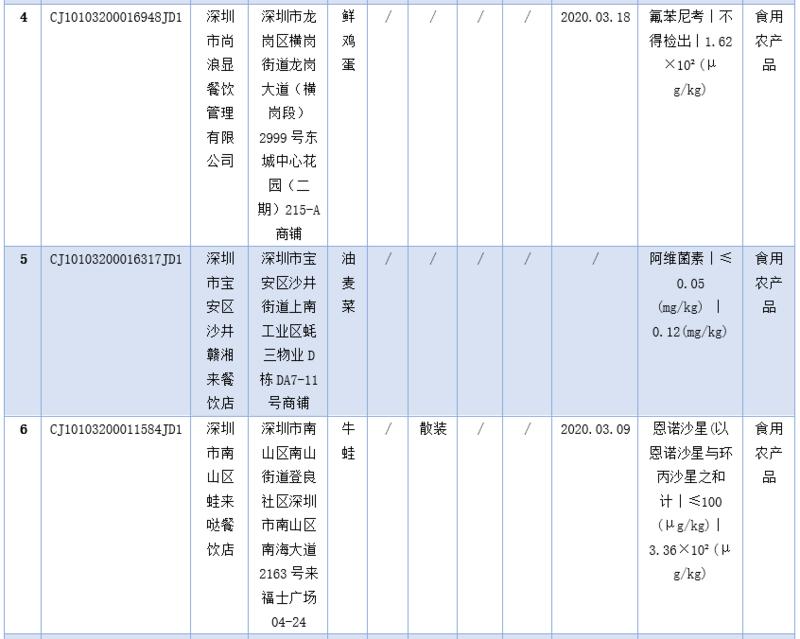 在不合格食品中,記者注意到,深圳市尚浪顯餐飲管理有限公司的鮮雞蛋及深圳市大汗食品有限公司的雞蛋均檢出氟苯尼考。據(jù)悉,氟苯尼考又稱氟甲砜霉素,是農(nóng)業(yè)部批準(zhǔn)使用的動(dòng)物專用抗菌藥,主要用于敏感細(xì)菌所致的豬、雞、魚的細(xì)菌性疾病?!秳?dòng)物性食品中獸藥最高殘留限量》中規(guī)定,氟苯尼考可用于豬、牛、羊、禽、魚等,在產(chǎn)蛋家禽中禁用(雞蛋、鵝蛋中不得檢出)。正常情況下消費(fèi)者不必對(duì)雞蛋、鵝蛋中檢出氟苯尼考過于擔(dān)心,但長期食用氟苯尼考?xì)埩舫瑯?biāo)的蛋品,對(duì)人體健康有一定風(fēng)險(xiǎn)。