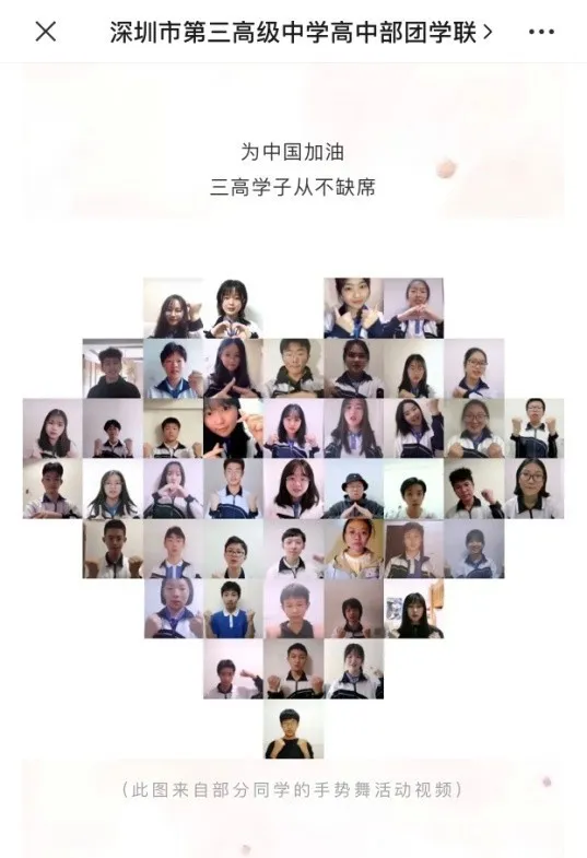 深圳市第三高級(jí)中學(xué)團(tuán)委的龐聰老師和同學(xué)們一起錄制了手勢舞《不放棄》,為抗疫一線吶喊加油!活動(dòng)先由龐聰老師和團(tuán)委學(xué)生聯(lián)合會(huì)的同學(xué)們策劃、學(xué)習(xí)、錄制、剪輯、審核,共同制作第一支手勢舞視頻。2月22日,他們在網(wǎng)上發(fā)起手勢舞接力,收到上百名師生發(fā)來的接力視頻,經(jīng)過校團(tuán)委匯總、剪輯、發(fā)布,引起強(qiáng)烈的社會(huì)反響。龐老師說:“疫情無情,人間有愛,正是疫情讓我們緊緊地依靠在一起,手勢舞應(yīng)援雖不隆重盛大,但卻也凝結(jié)了我們師生對于疫情重地武漢的鼓勵(lì)與支持,對一線醫(yī)療工作者的無私奉獻(xiàn)的感謝?!?/p>