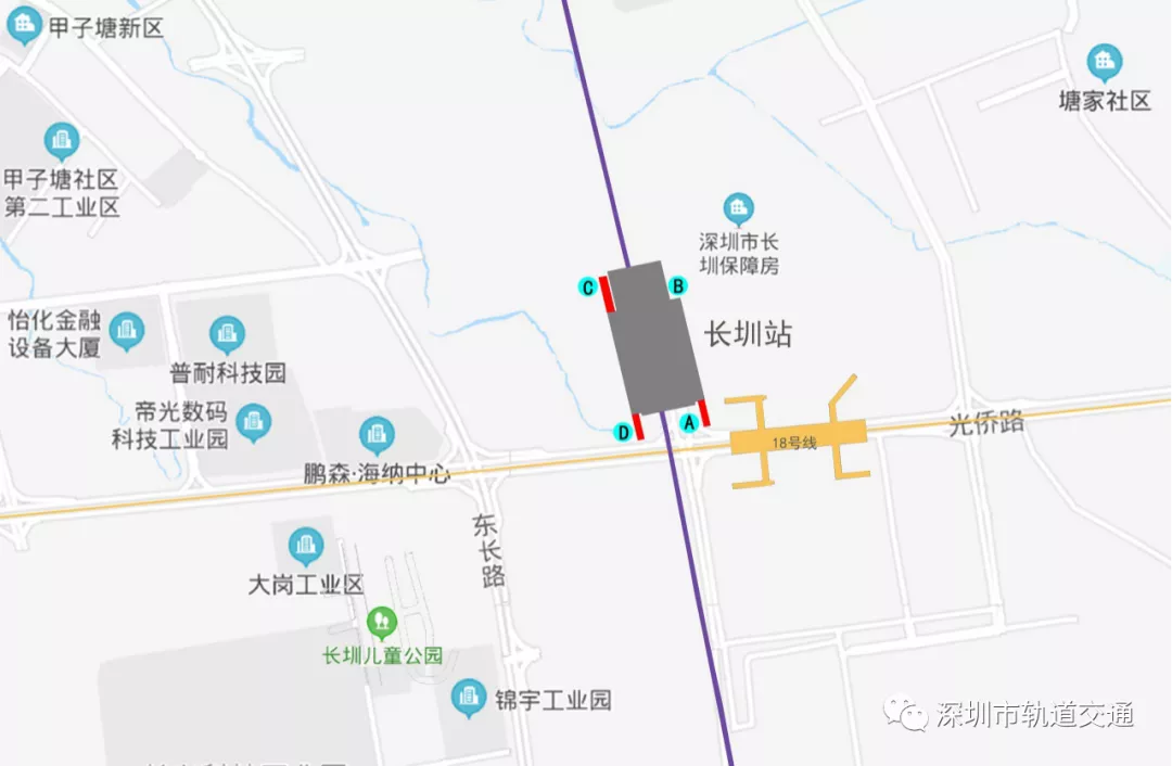 其中,A、D出入口位于車站南側(cè)(科裕路東西兩側(cè)),兼24小時(shí)過街功能并設(shè)置無障礙電梯;B出入口位于車站北側(cè)(科裕路東側(cè)),樓梯部分從車站主體下至地面,扶梯部分近期將接入正在施工的保障房二層平臺(tái);C出入口位于車站北側(cè)(科裕路西側(cè))。